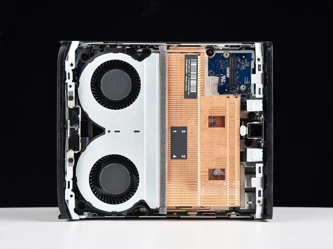 Hardware maintenance: The side panel slides off tool-free with a small lever, revealing generous copper heatsink fins and dual fans. This is genuinely modular: storage and memory are user-accessible, a genuine rarity in mini workstations.
