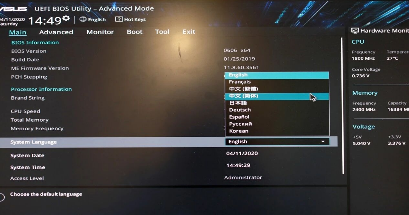 2. BIOS Prep: Insert your Windows bootable USB drive. Power on and hit F2 to enter BIOS. Ensure your language is set to English and set the USB drive as the primary boot device.