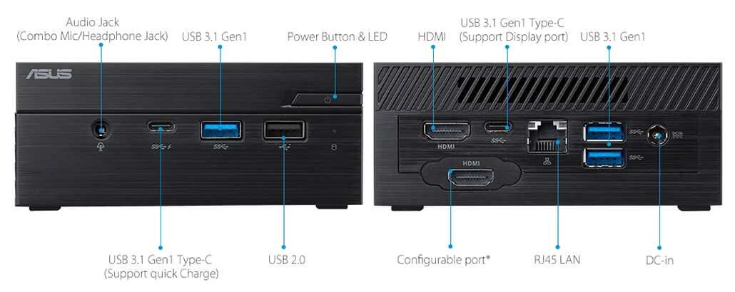 • Rear: HDMI 2.0, Mini DisplayPort (configurable), and additional USB ports.