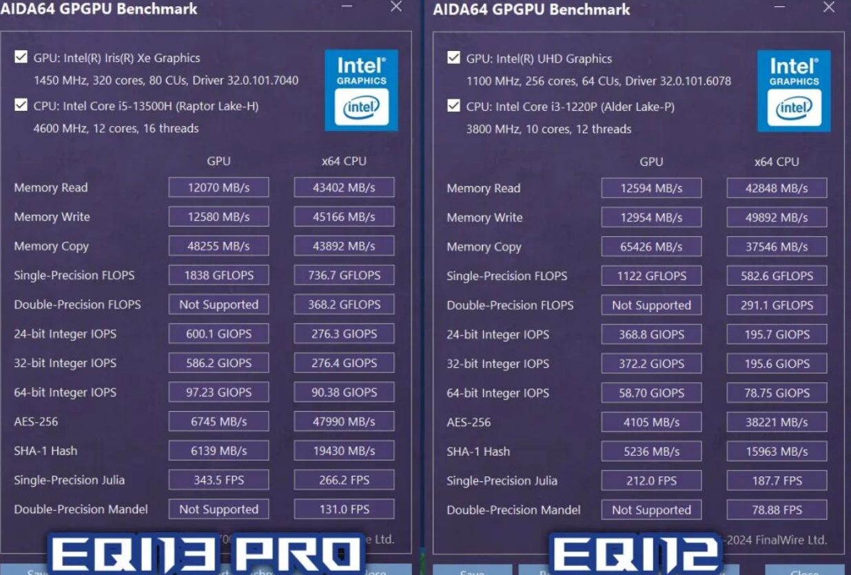 GPU performance jumps even more dramatically. Intel's 80EU Iris Xe (EQi13 Pro) versus 64EU UHD (EQi12) showed 60%+ gains in synthetic benchmarks: