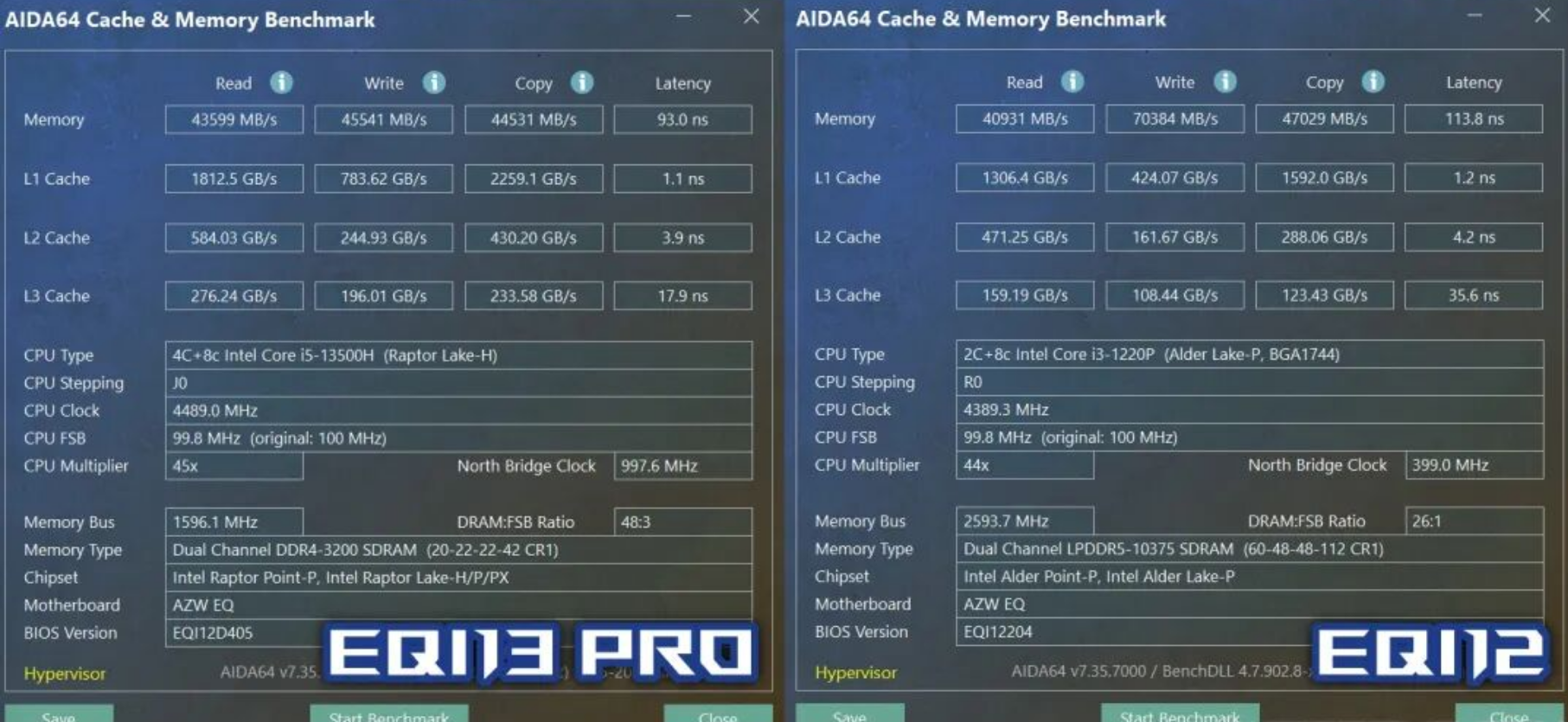 Processor uplift is substantial. I ran CPU-Z against the EQi12's i3-1220P baseline: the i5-13500H's 4P+8E core configuration (vs. 2P+4E) delivered a 30% multithread gain while holding identical 35W TDP. In Cinebench R23, I measured 36.8% advantage, both systems maxing their power envelope. The extra P-cores matter more than core count suggests.