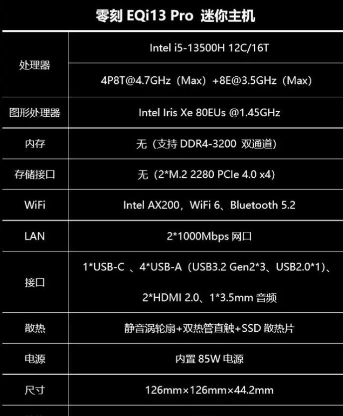 Beelink EQi13 Pro (i5) | i5-13500H | 0GB (SO-DIMM) | 0GB (M.2) | $240 base | Compact, silent at idle |