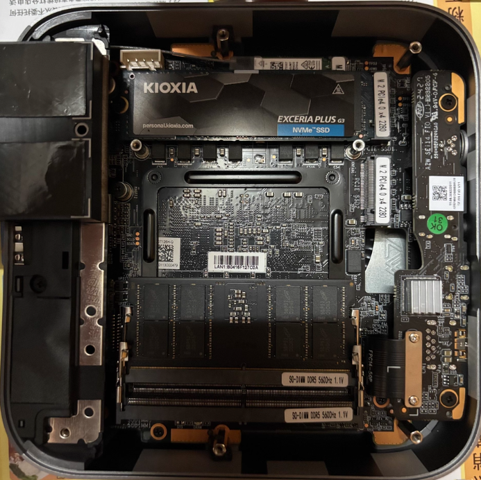 Internally, the layout is tidy. It supports up to 96GB of DDR5 RAM and features dual M.2 PCIe 4.0 slots. Both SSD slots are covered by a large heatsink, ensuring sustained performance during data migration or heavy transfers.