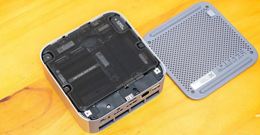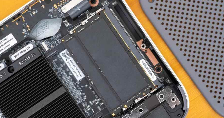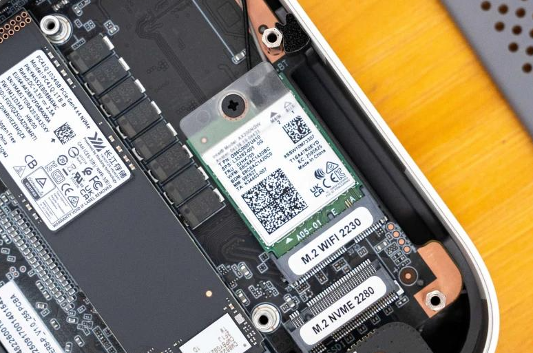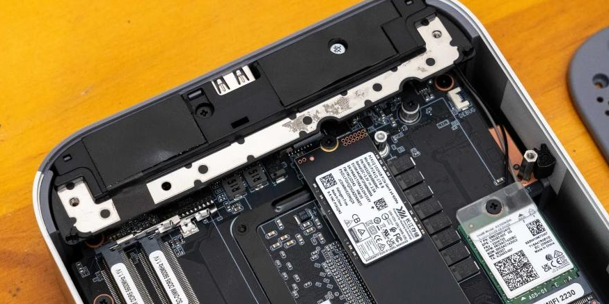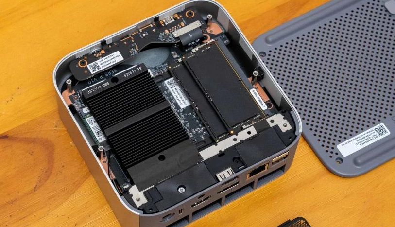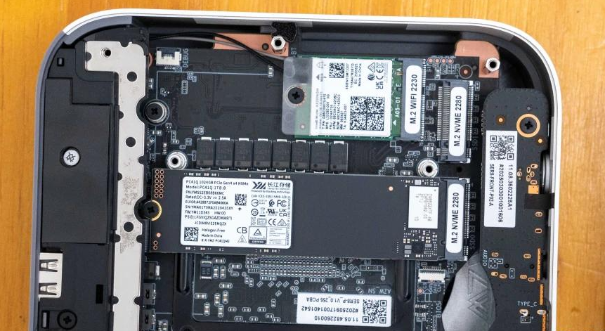 I was impressed by the engineering attention here. The heatsink uses a slotted design—increasing air contact surface area—with copper thermal pads that distribute heat efficiently. When I disassembled the unit, I noticed metal heat spreaders flanking both DDR5 memory modules, and the SSD radiator rivals some laptop designs in thickness.