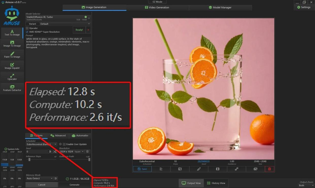 Compare this to RTX 4070 laptops (~0.15 iter/sec). The Radeon 8060S is 4-5× slower here, but it's still usable for serious work if you're willing to wait. Lighter models like Stable Diffusion XL Turbo hit 2.6 iterations/second for 2048×2048 images—that's practical.