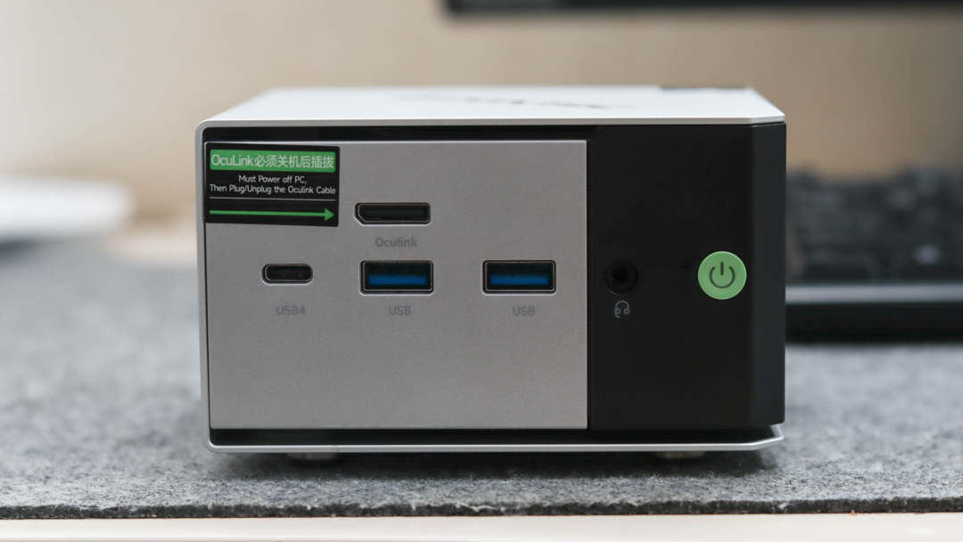 • Front: 1x OCuLink (PCIe 4.0 x4), 1x USB4 (40Gbps), 2x USB 3.2 Gen 2.