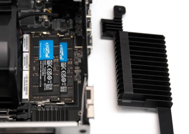 Four DDR5 SODIMM slots with 6000+ MHz support and optional ECC—rare for mini form factor