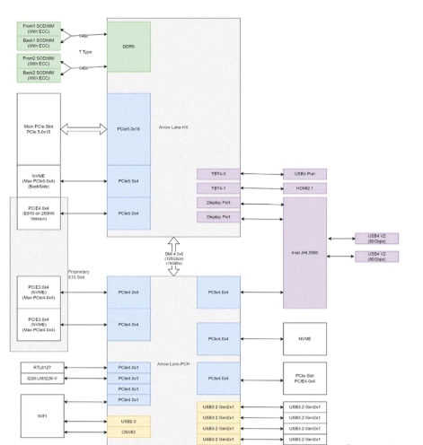 RAM: 4× DDR5 SODIMM (single-channel layout); supports up to 192GB theoretical max; T-topology layout optimizes frequency for full occupancy